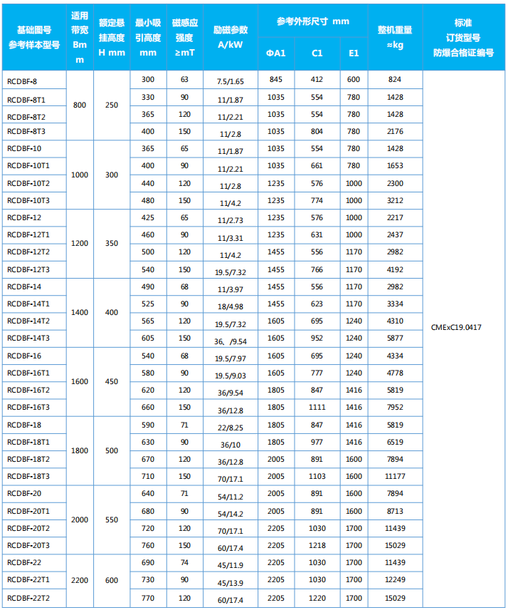 四、RCDBF系列粉塵防爆型盤式電磁除鐵器主要技術參數(shù)、外形尺寸